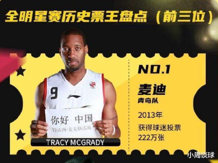 今年CBA全明星赛的票王是广东宏远队的小将徐杰,一共拿到了842453张球迷选票,而CBA全明星赛历史票王则是青岛队的外援麦蒂,他在2013年全明星的投票中一共获得了222万张的球迷投票。麦蒂是NBA当年叱咤风云的四大分卫之一,不仅和科比、艾弗森、卡特等超级明星齐名,更是因为火箭队的“姚麦组合”为中国球迷所熟知。